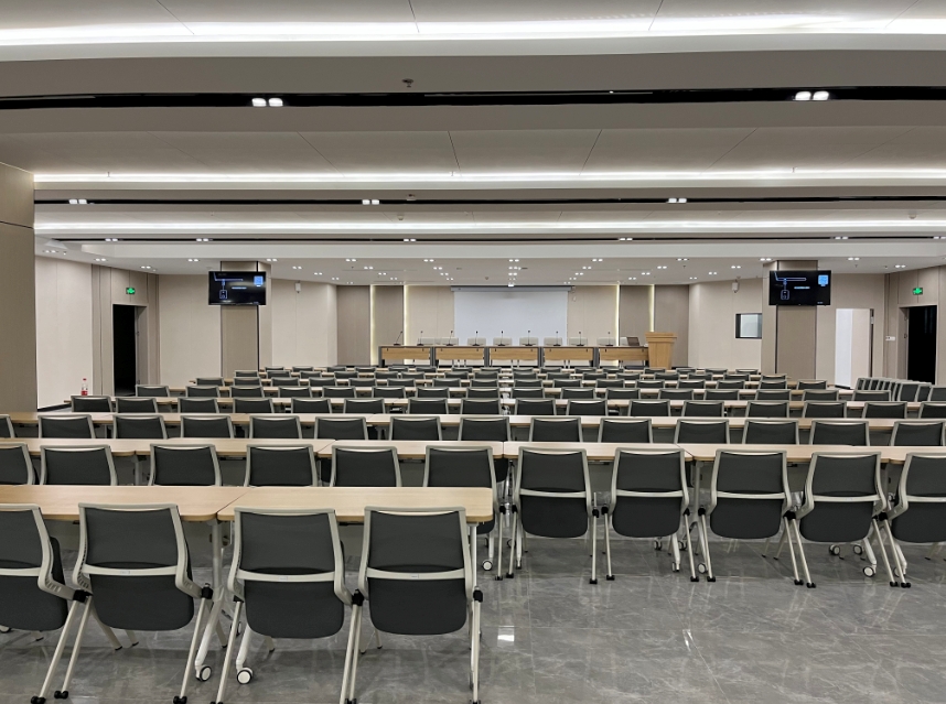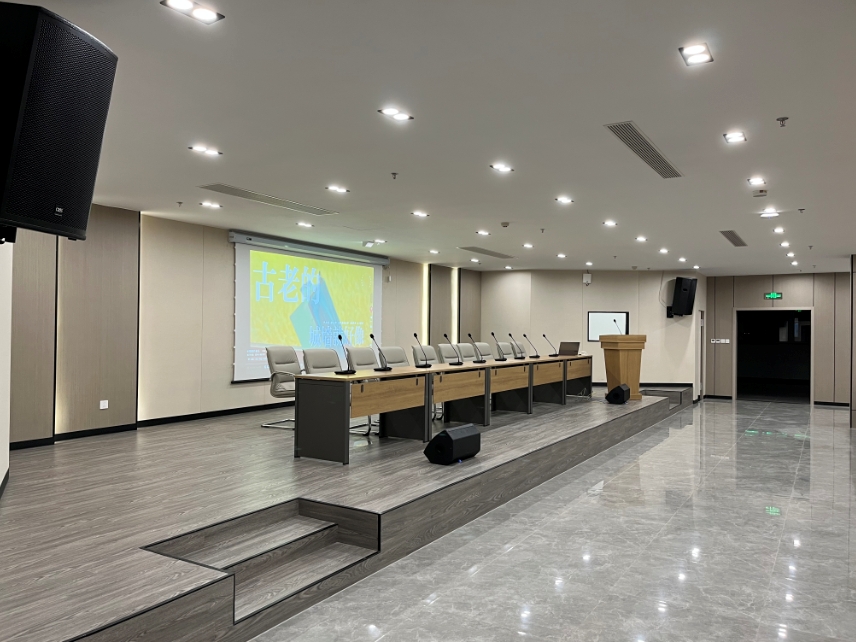二樓報告廳用于平常會議的開展,音頻擴聲和顯示作為其主要需求點。因二樓報告廳層高限制,同時報告廳深度較深,為此顯示部分采用了多臺電視機作為輔助顯示,音頻擴聲部分也采用了多只輔助音響。
