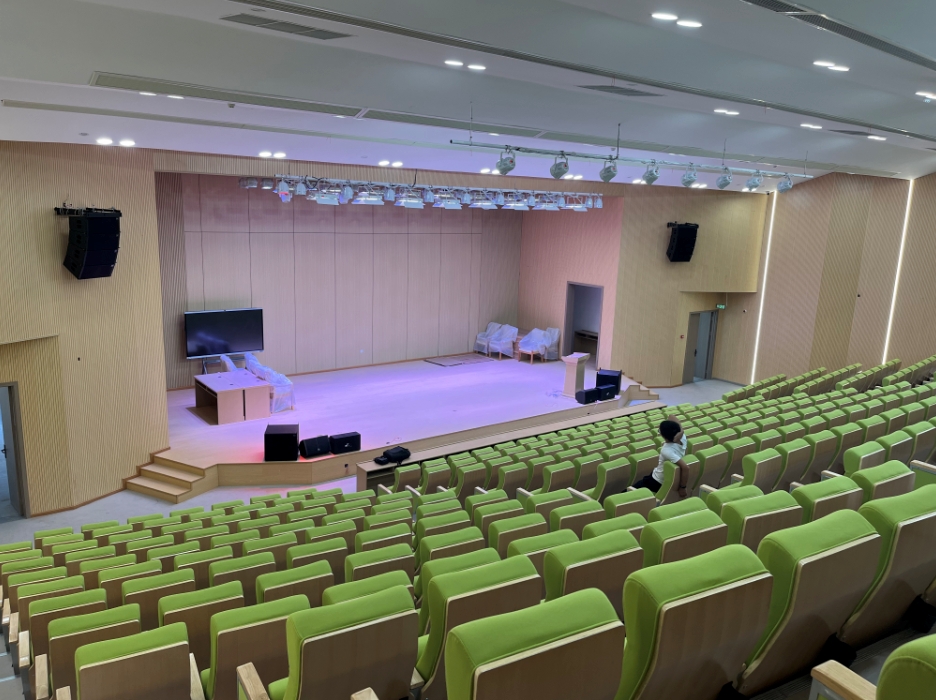 因多功能廳整體建筑面積較大,同時(shí)為階梯式設(shè)計(jì),顧在擴(kuò)聲方面我司采用兩組線陣,通過(guò)調(diào)整線陣角度使聲場(chǎng)均勻分布,同時(shí)設(shè)計(jì)了臺(tái)唇和返聽(tīng)使各個(gè)位置聲音清晰均勻。