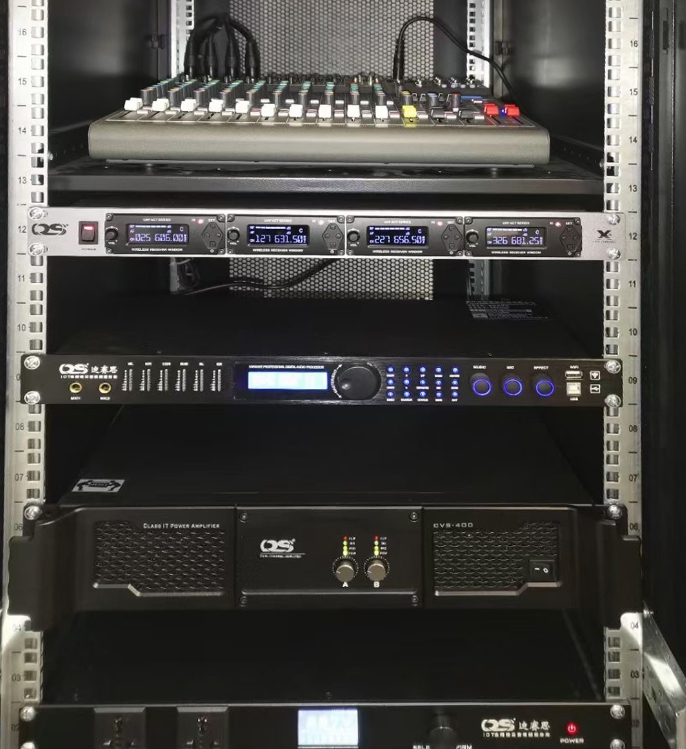 河濱未來社區(qū)會議室,采用全頻音響作為擴聲,前級所有設(shè)備全部在機柜內(nèi),包含無線話筒、調(diào)音臺、音頻處理器、功率放大器和時序電源。操作簡單,只需要時序器一鍵開啟電源,話筒音量通過調(diào)音臺直接進行調(diào)整,滿足會議室使用需求。