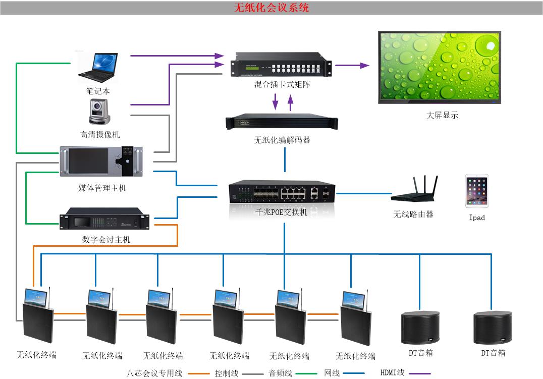 生產(chǎn)樓會(huì)議室為主要改造點(diǎn),擴(kuò)聲系統(tǒng)更換8寸全頻揚(yáng)聲器,滿(mǎn)足現(xiàn)場(chǎng)擴(kuò)聲。矩陣切換新增插卡式混合矩陣,滿(mǎn)足桌插、視頻終端多個(gè)信號(hào)源,以及投影主顯示和大尺寸電視機(jī)的顯示切換。另配置一套集中控制系統(tǒng),可實(shí)現(xiàn)平板對(duì)會(huì)議室音量大小、信號(hào)切換、設(shè)備開(kāi)關(guān)和視頻終端等智能控制。為體現(xiàn)會(huì)議室高端大氣,以及會(huì)議進(jìn)程無(wú)紙化和簡(jiǎn)便化,配置8臺(tái)華為平板作為無(wú)紙化會(huì)議系統(tǒng)終端設(shè)備,結(jié)合無(wú)紙化會(huì)議軟件,實(shí)現(xiàn)整個(gè)會(huì)議進(jìn)程無(wú)紙化,視頻終端等外部信號(hào)均可上平板同屏顯示。